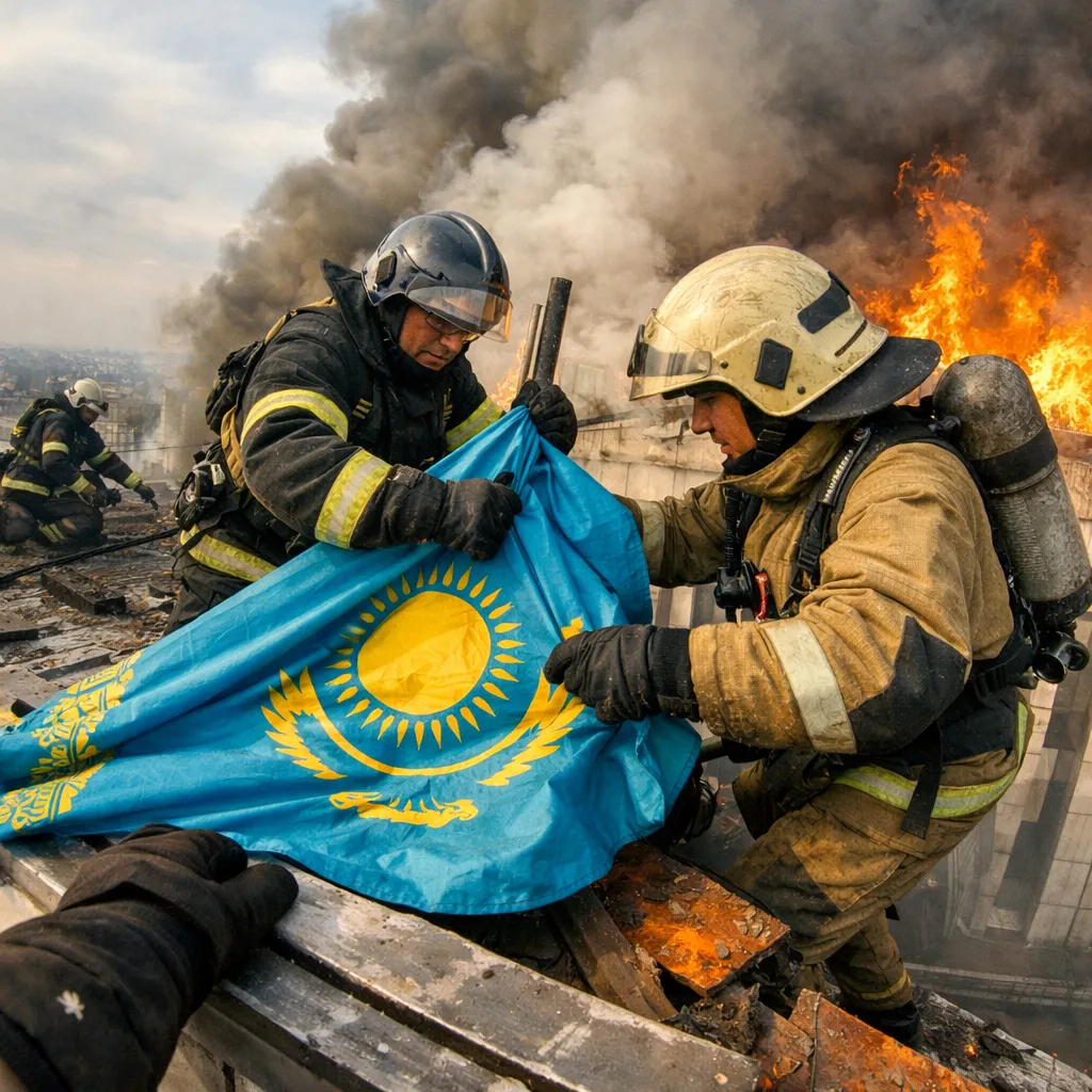 🇰🇿 Құтқарушылар жанып жатқан әкімдік ғимаратының шатырынан Қазақстанның туын алып түсті.
