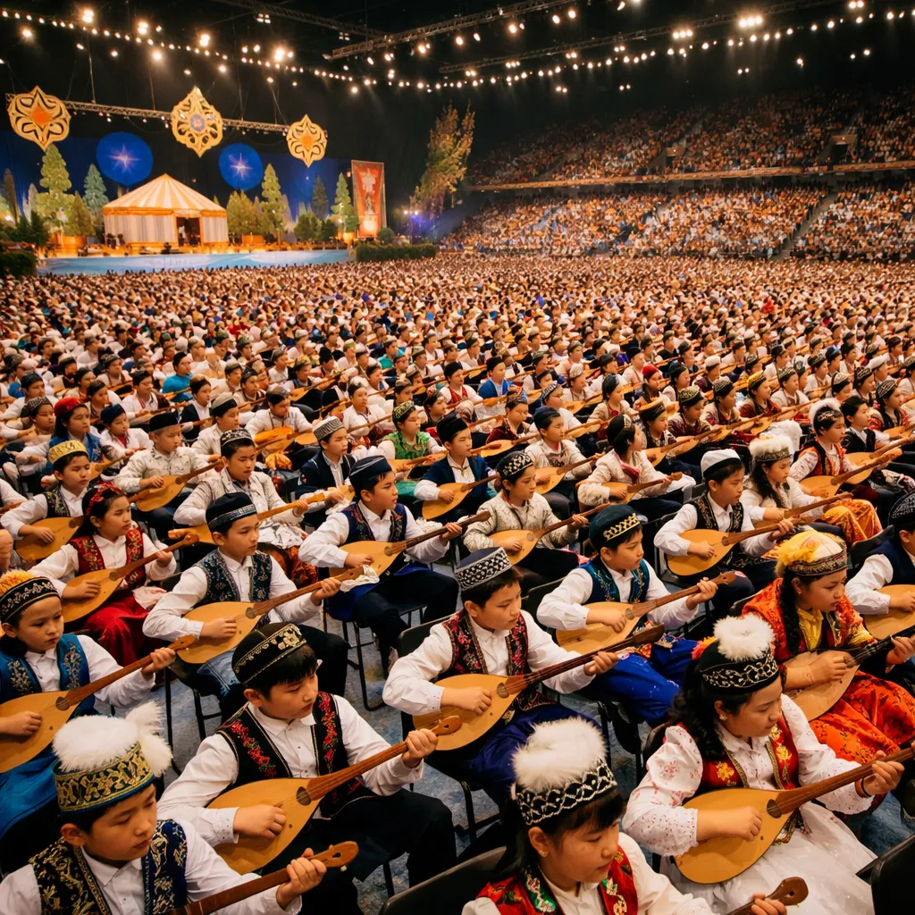 Школьники, объединившись в один оркестр, одновременно исполнили специально подготовленное музыкальное попурри. Тысячи голосов домбры звучали в унисон, символизируя единство нового поколения Казахстана.