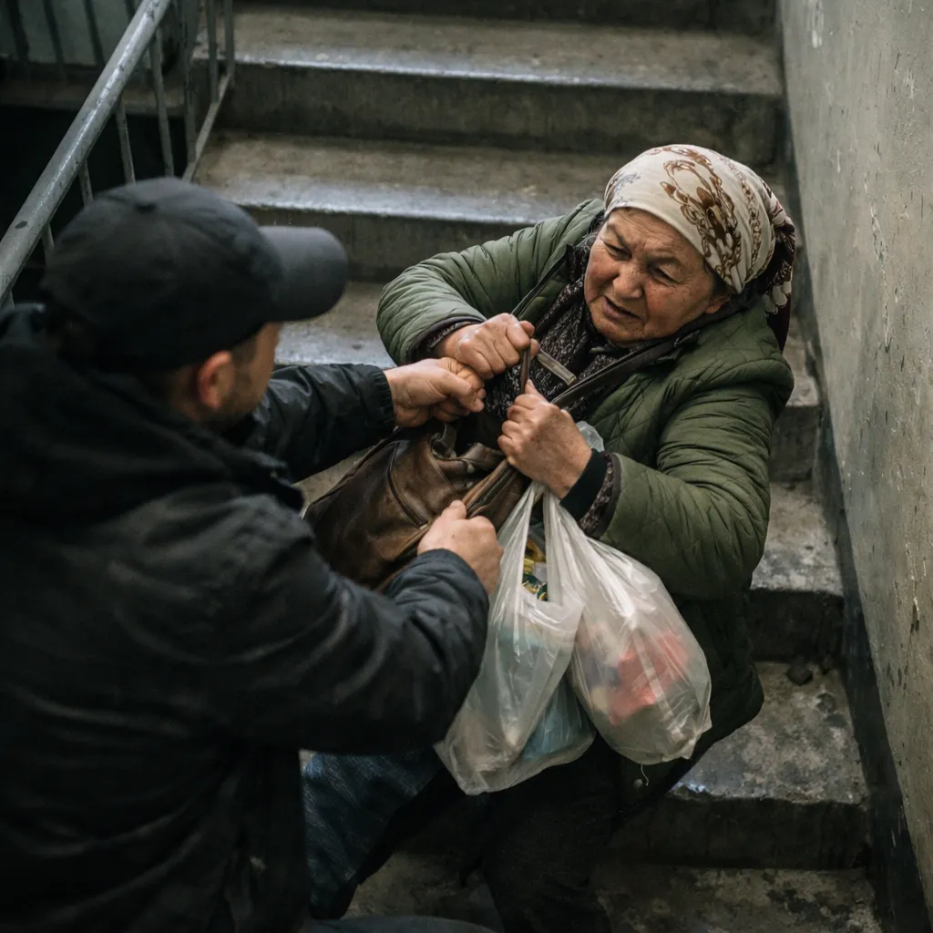 Записи камер наблюдения показывают, как мужчина тянет пенсионерку по лестнице, пытаясь забрать сумки. Однако женщина оказала сопротивление, и злоумышленник убежал, не сумев отобрать имущество.