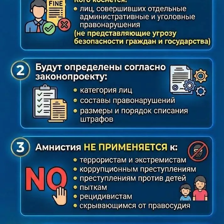В настоящее время Министерство внутренних дел совместно с Министерством юстиции прорабатывает предложения по механизму реализации амнистии. Категории лиц, составы правонарушений, размеры и порядок списания штрафов будут определены при подготовке соответствующего законопроекта.